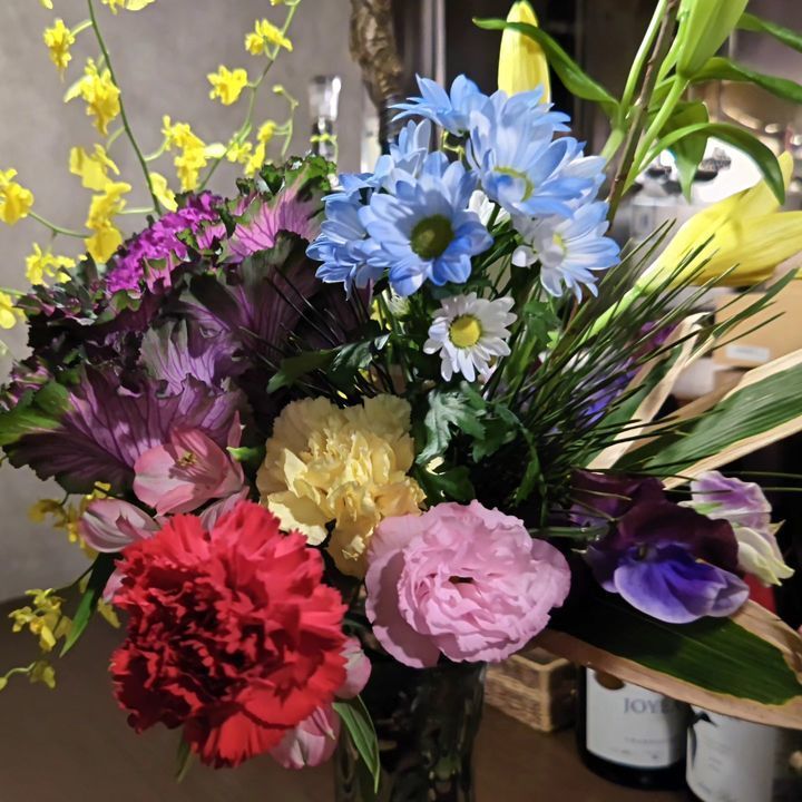 昨夜、主人宛にお客様からいただいたお花に笹と松を足して