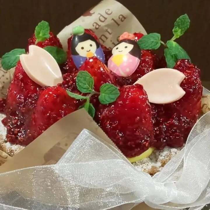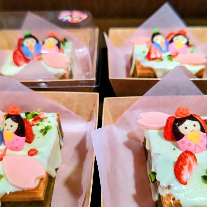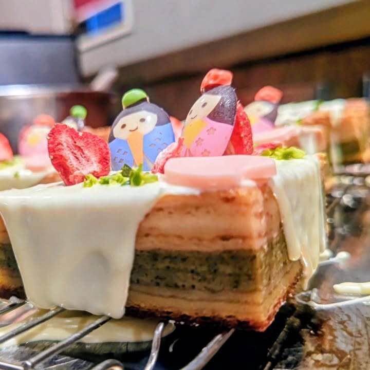 何となく、層を成したバウムクーヘンを製作したく、下からプレーン、苺、本山茶と生地を重ね、トップにホワイトショコラと雛チョコと花弁チョコ、フリーズドライの苺でデコレート。
