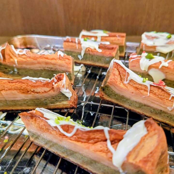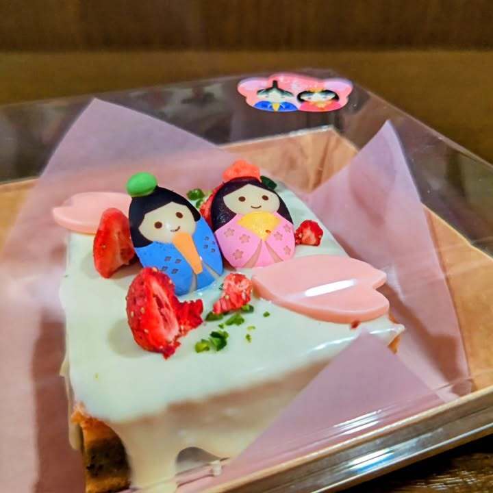 何となく、層を成したバウムクーヘンを製作したく、下からプレーン、苺、本山茶と生地を重ね、トップにホワイトショコラと雛チョコと花弁チョコ、フリーズドライの苺でデコレート。